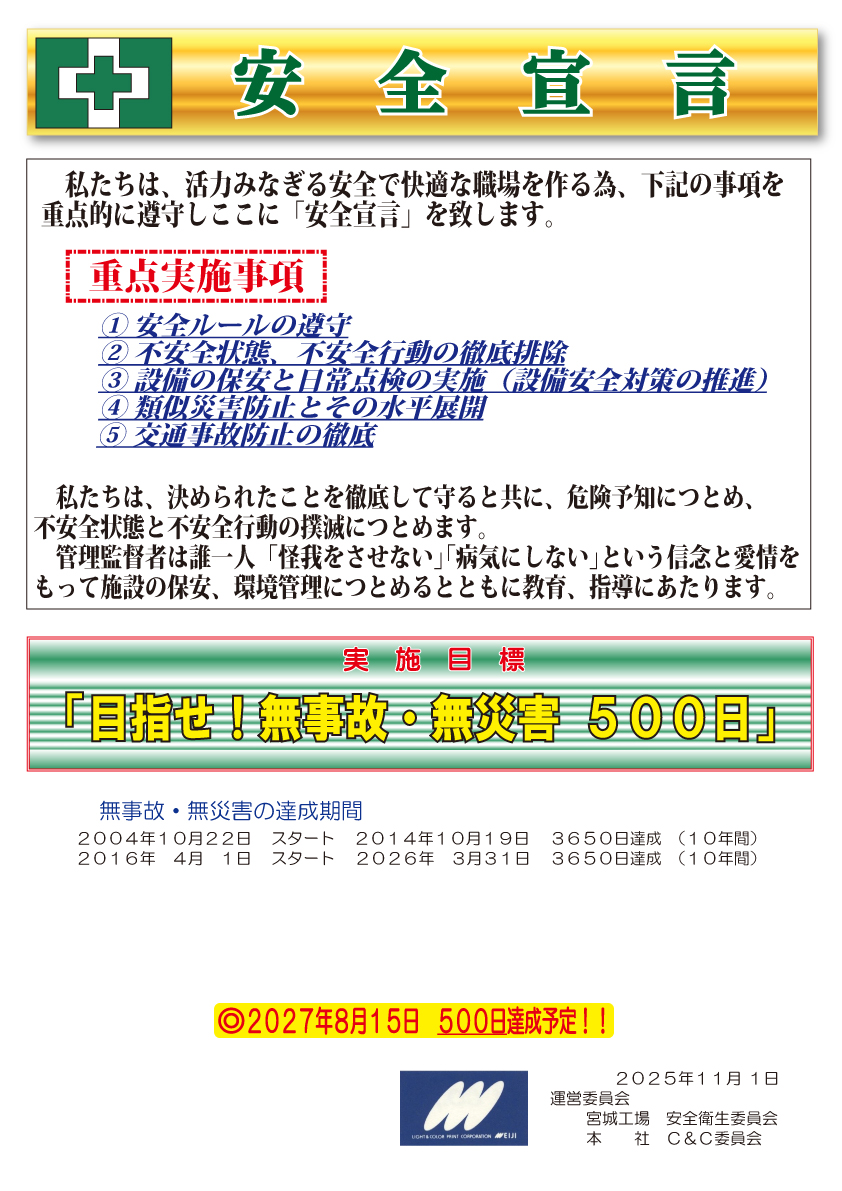 2025年11月1日に『無事故無災害3500日』を達成しました。 これは全社員が一丸となり安全衛生に取り組んできた結果です。 これからも”怪我をさせない、病気にしない”を基本に再スタートし、 無事故無災害10年(2026年3月31日達成予定)を目標に安全衛生管理を徹底していきます。